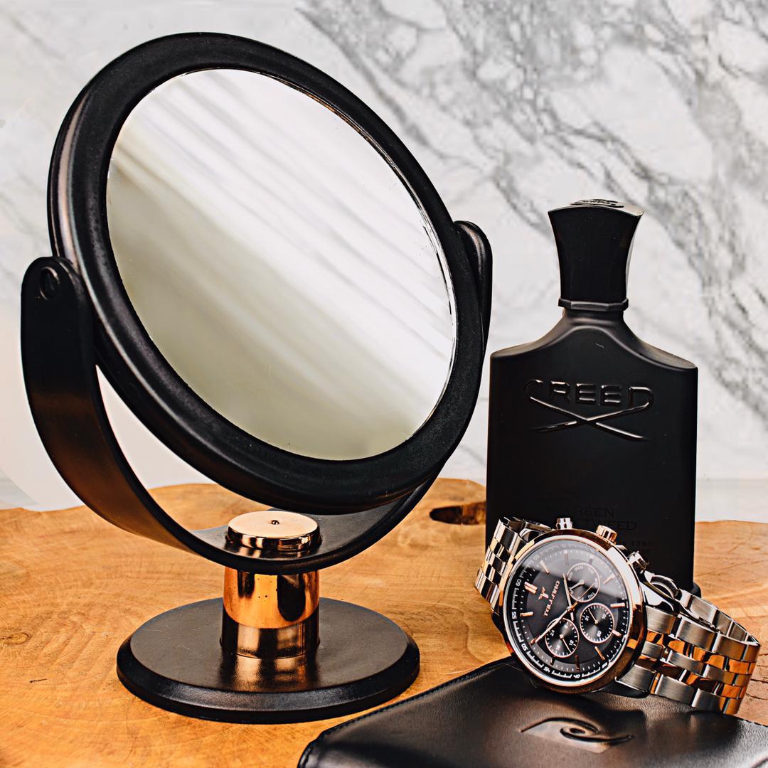همچنین پایه زیرین آینه ارایشی رومیزی طوری طراحی شده است که از افتادن آن جلوگیری می کند، قابلیت تنظیم زاویه آینه را می دهد و ترکیب رنگ مشکی و طلایی آن زیبایی محصول را دو چندان می کند.