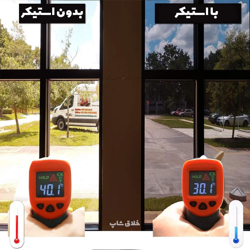 این استیکر باعث میشه شما از داخل بتونی بیرون رو ببینی ولی از بیرون پنجره داخل محیط دیده نمیشه و از بیرون مثل آیینه رفلکس میندازه. از جهتی چون باعث انعکاس نور از بیرون میشه باعث میشه گرمای بیش از حد به پنجره جذب نشه و تو تابستون دمای خونه خنک تر میشه.