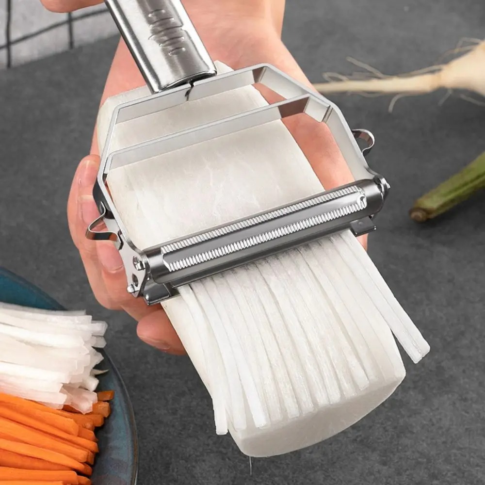 پوست کن و رشته کن دو کاره این محصول بی نظیر و درجه یک جز پرطرفدارترین ابزار خلاقانه و کاربردی آشپزخانه، علاوه بر پوست کردن انواع میوه جات و صیفی جات این اجازه را به شما می دهد، که به راحتی آنها را رشته رشته و اسلایس کنید.
