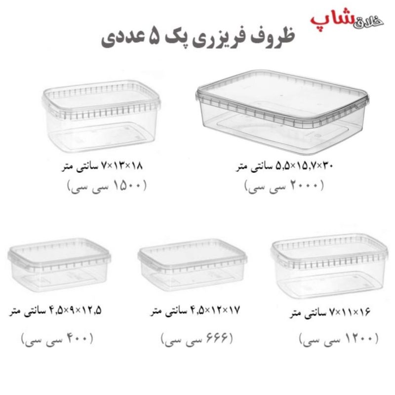 در این پک از سایز هایی با حجم 400 , 666 , 1200 , 1500 و 2000 سی سی تهیه و اماده عرضه می باشد تا بتوانید با خرید یک مجموعه ، صاحب 5 عدد ظرف فریزری هر ۵ سایز از این محصول شوید. (ابعاد در توضیحات محصول درج شده است)